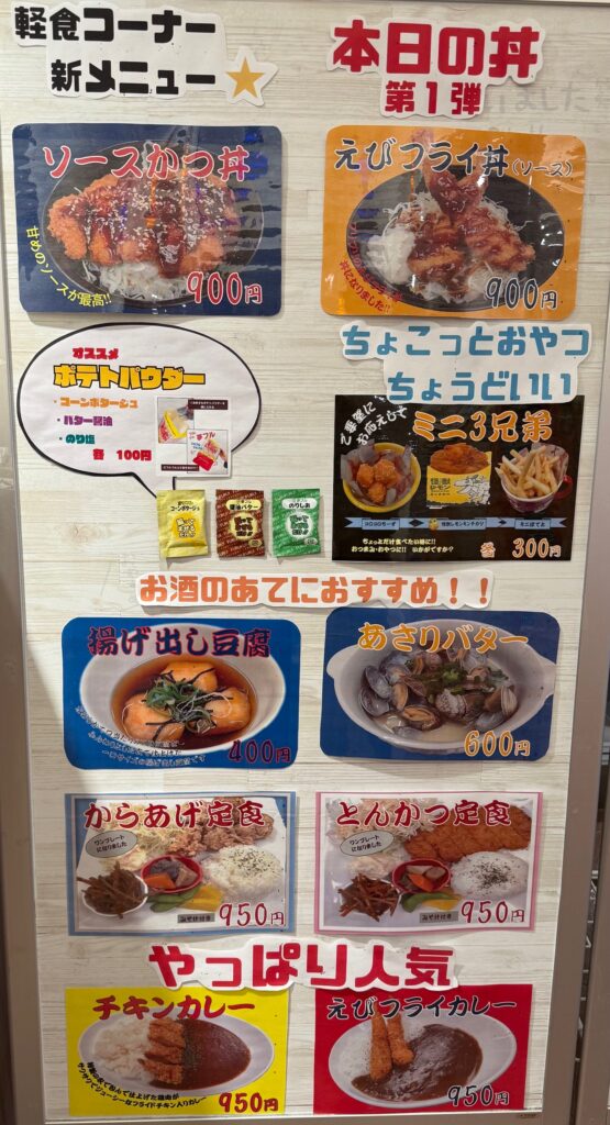 | ラーメン 700円 | おすまし(餅入り) 300円 | エビフライカレー 950円 |