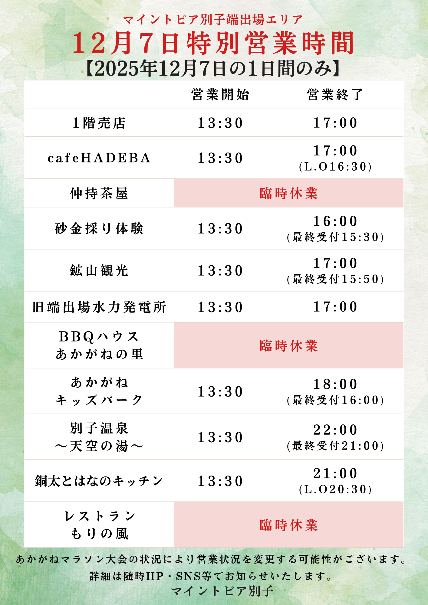 2025年12月7日(日)マイントピア別子 端出場エリアの営業時間を