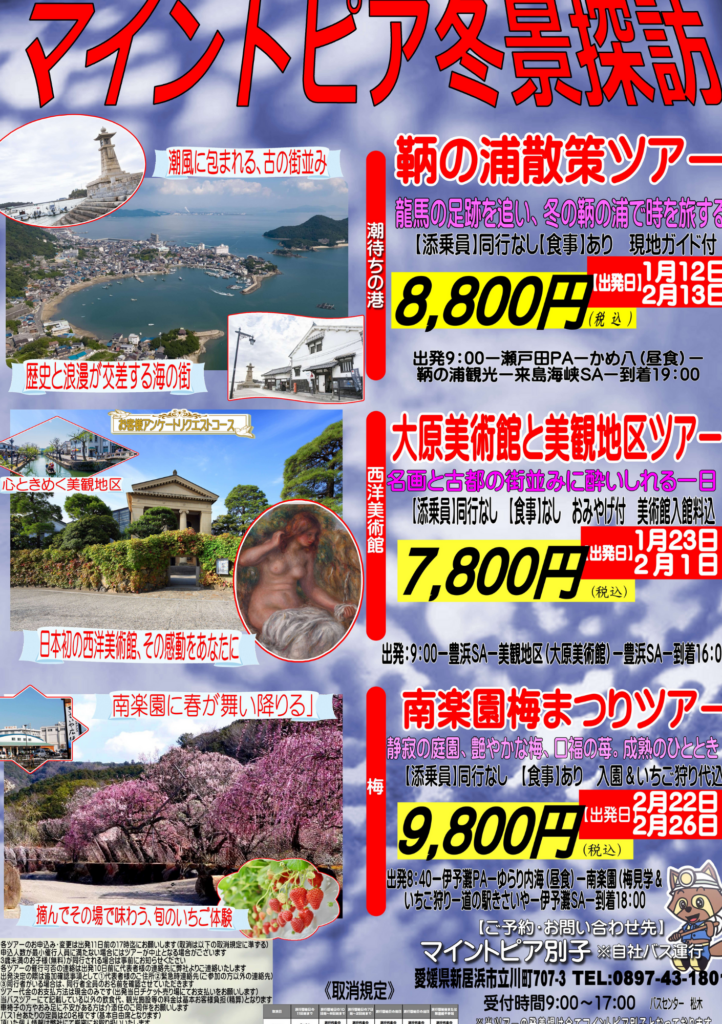 8:40マイントピア別子発ー伊予灘PAーゆらり内海(昼食)ー南楽園(梅見学&いちご狩り)ー道の駅きさいやー伊予灘SAー18:00マイントピア別子解散