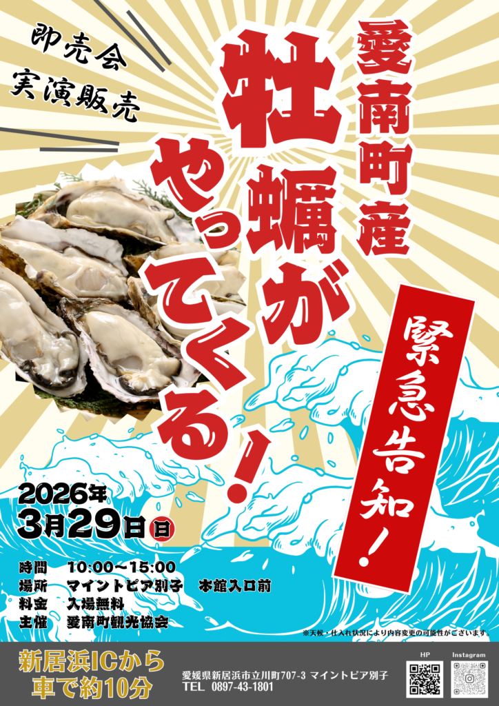 2026年3月29日(日)限定で、マイントピア別子に愛南町の新鮮な牡蠣がやってきます!